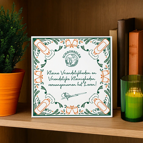 Karakteristiek Schrobbelèr tegeltje met een spreuk van ontdekker Jan Wassing: ‘Kleine vriendelijkheden en vriendelijke kleinigheden veraangenamen het leven’.